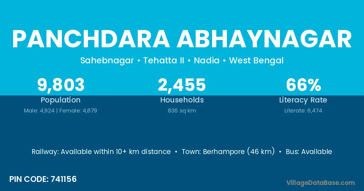 Berhampore (46 km) is the nearest town to Panchdara Abhaynagar village for major economic activities and is located approximately 46 km away.