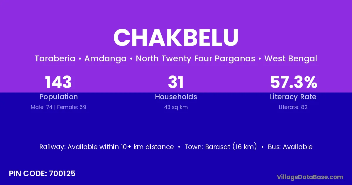 Barasat (16 km) is the nearest town to Chakbelu village for major economic activities and is located approximately 16 km away.