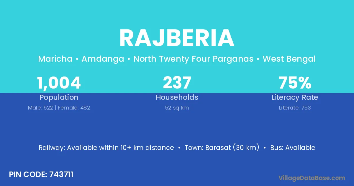 Barasat (30 km) is the nearest town to Rajberia village for major economic activities and is located approximately 30 km away.