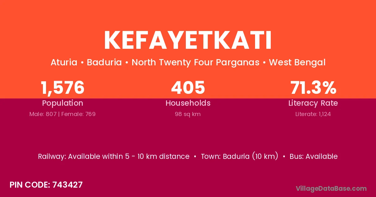 Baduria (10 km) is the nearest town to Kefayetkati village for major economic activities and is located approximately 10 km away.