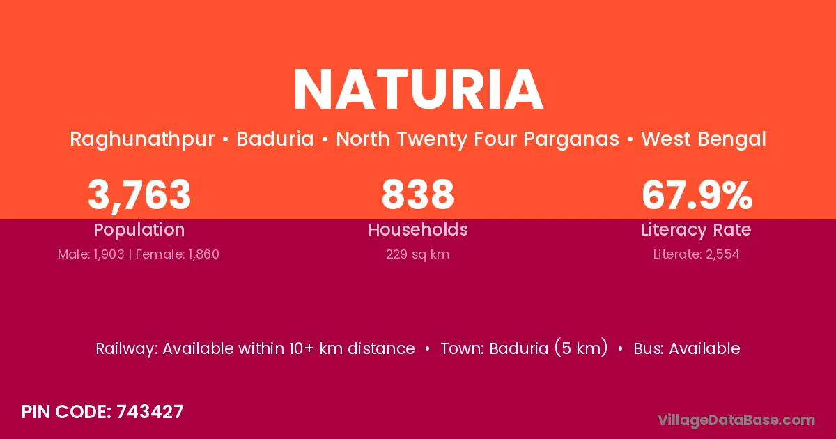 Baduria (5 km) is the nearest town to Naturia village for major economic activities and is located approximately 5 km away.