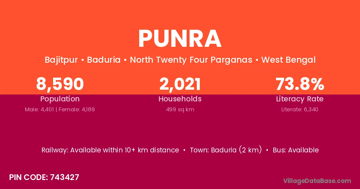 Baduria (2 km) is the nearest town to Punra village for major economic activities and is located approximately 2 km away.