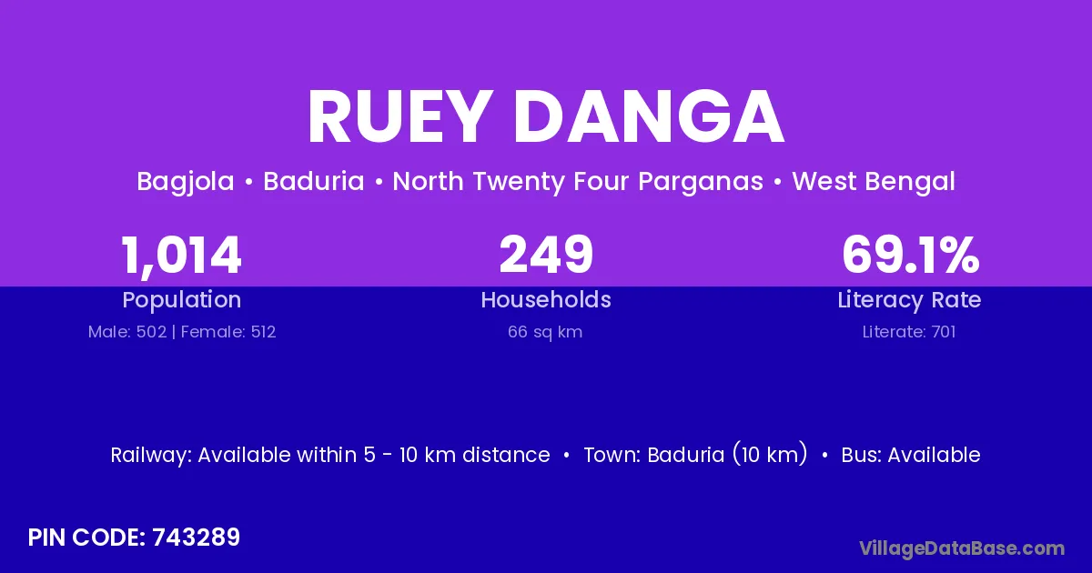 Baduria (10 km) is the nearest town to Ruey Danga village for major economic activities and is located approximately 10 km away.