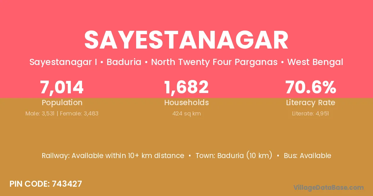 Baduria (10 km) is the nearest town to Sayestanagar village for major economic activities and is located approximately 10 km away.