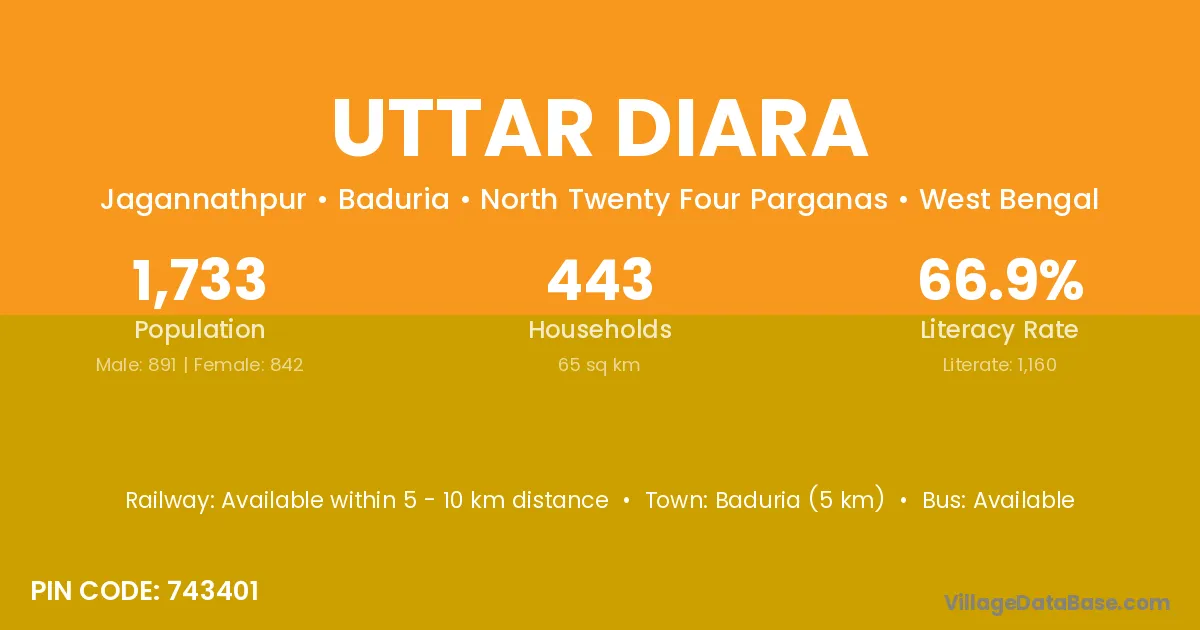 Baduria (5 km) is the nearest town to Uttar Diara village for major economic activities and is located approximately 5 km away.