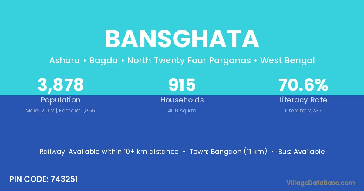 Bangaon (11 km) is the nearest town to Bansghata village for major economic activities and is located approximately 11 km away.