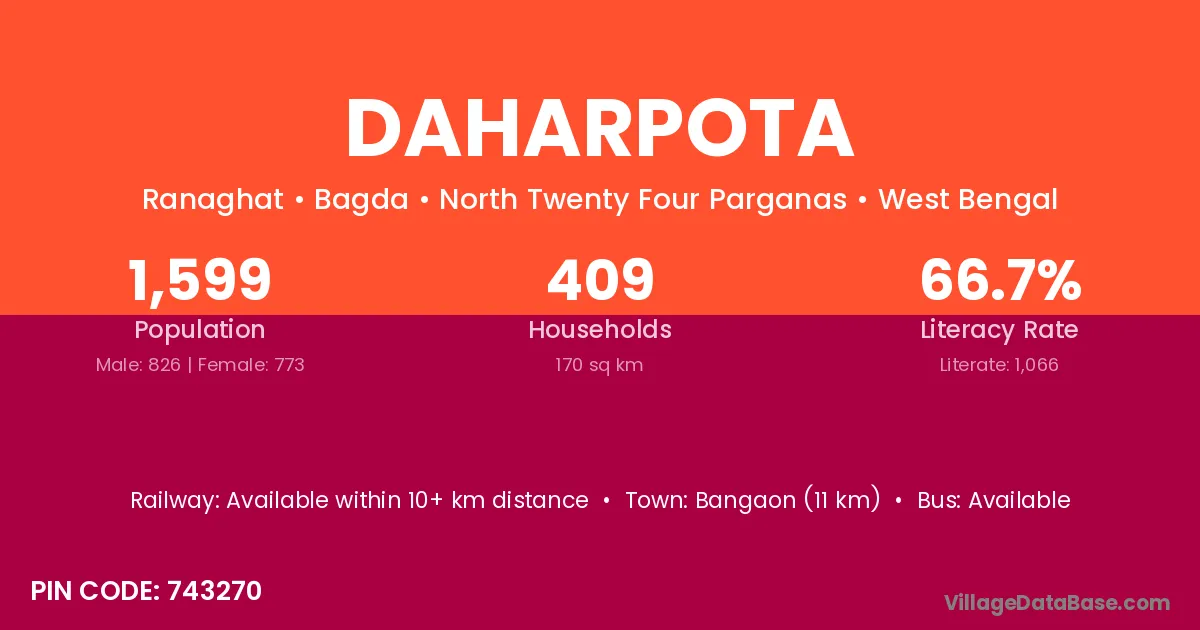 Bangaon (11 km) is the nearest town to Daharpota village for major economic activities and is located approximately 11 km away.