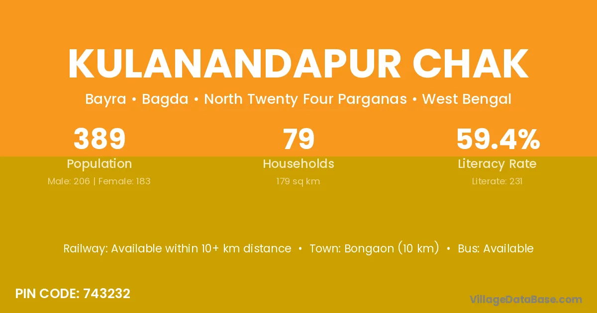 Bongaon (10 km) is the nearest town to Kulanandapur Chak village for major economic activities and is located approximately 10 km away.