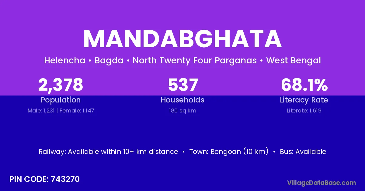 Mandabghata village has a total population of 2,378 people, of which 1,231 are males and 1,147 are females.
