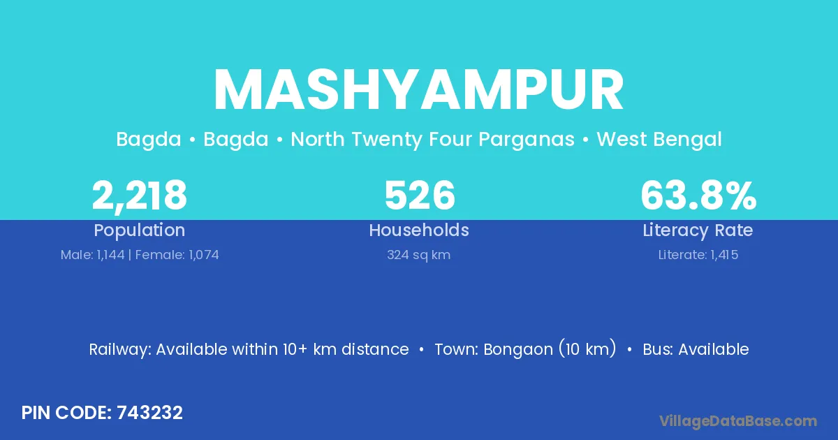 Bongaon (10 km) is the nearest town to Mashyampur village for major economic activities and is located approximately 10 km away.