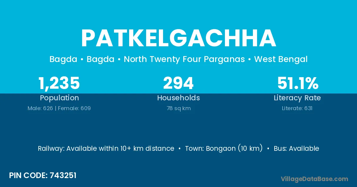 Bongaon (10 km) is the nearest town to Patkelgachha village for major economic activities and is located approximately 10 km away.