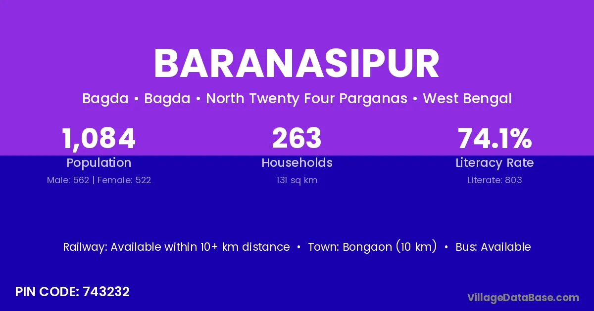 Bongaon (10 km) is the nearest town to Baranasipur village for major economic activities and is located approximately 10 km away.