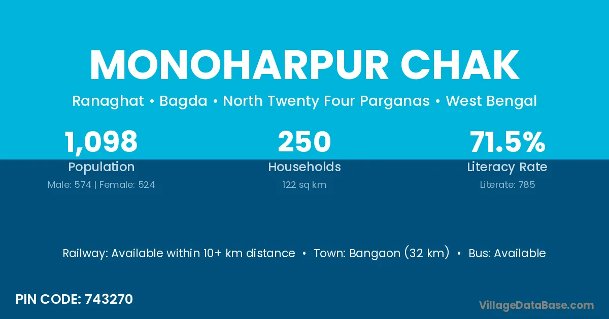 Bangaon (32 km) is the nearest town to Monoharpur Chak village for major economic activities and is located approximately 32 km away.