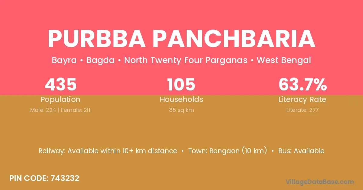 Bongaon (10 km) is the nearest town to Purbba Panchbaria village for major economic activities and is located approximately 10 km away.