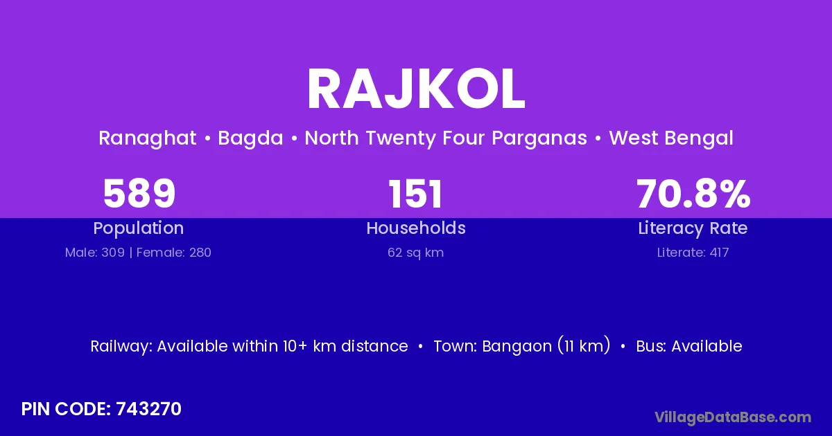 Bangaon (11 km) is the nearest town to Rajkol village for major economic activities and is located approximately 11 km away.