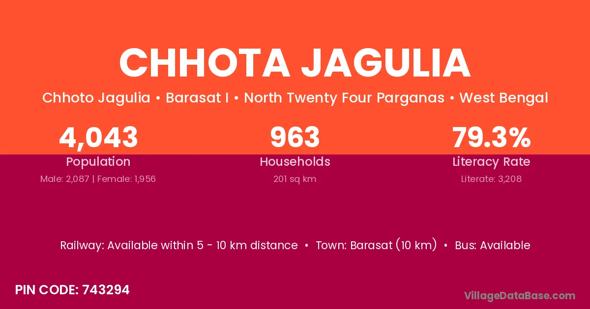 Barasat (10 km) is the nearest town to Chhota Jagulia village for major economic activities and is located approximately 10 km away.