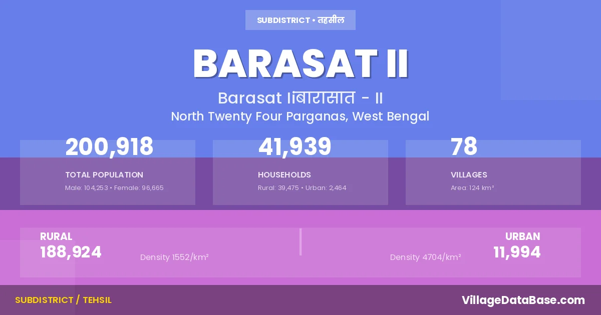 According to the 2011 census The total area of Barasat II Subdivision is 124 km², with a population of 200918 people. The population density is 1,617 inhabitants per square kilometre, and there are approximately 41939 houses in the sub district.