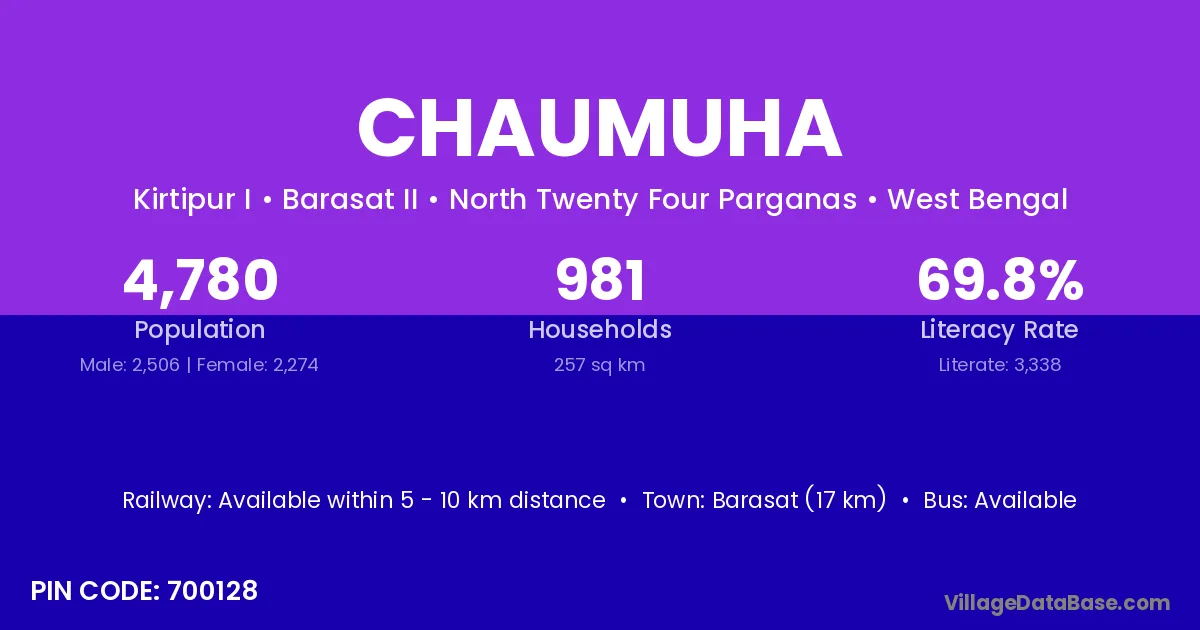 Barasat (17 km) is the nearest town to Chaumuha village for major economic activities and is located approximately 17 km away.