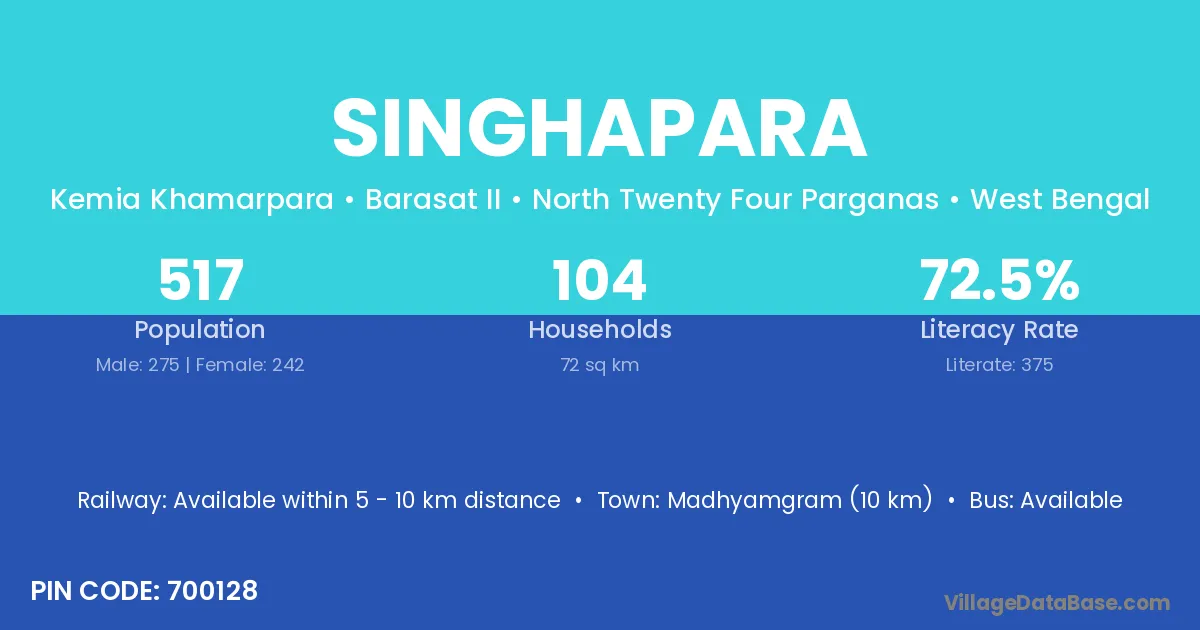 Madhyamgram (10 km) is the nearest town to Singhapara village for major economic activities and is located approximately 10 km away.