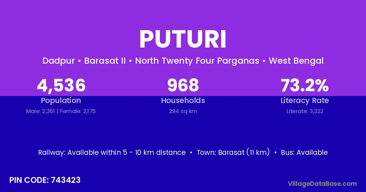 Barasat (11 km) is the nearest town to Puturi village for major economic activities and is located approximately 11 km away.