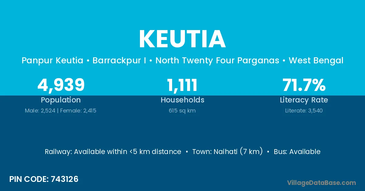 Naihati (7 km) is the nearest town to Keutia village for major economic activities and is located approximately 7 km away.
