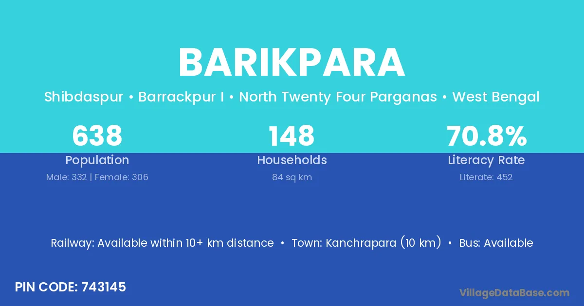 Kanchrapara (10 km) is the nearest town to Barikpara village for major economic activities and is located approximately 10 km away.