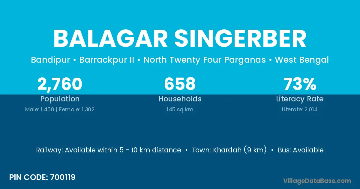 Khardah (9 km) is the nearest town to Balagar Singerber village for major economic activities and is located approximately 9 km away.