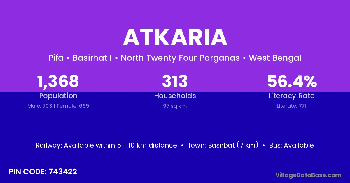 Atkaria village is located in the Basirhat I Subdivision of the North Twenty Four Parganas district in West Bengal.