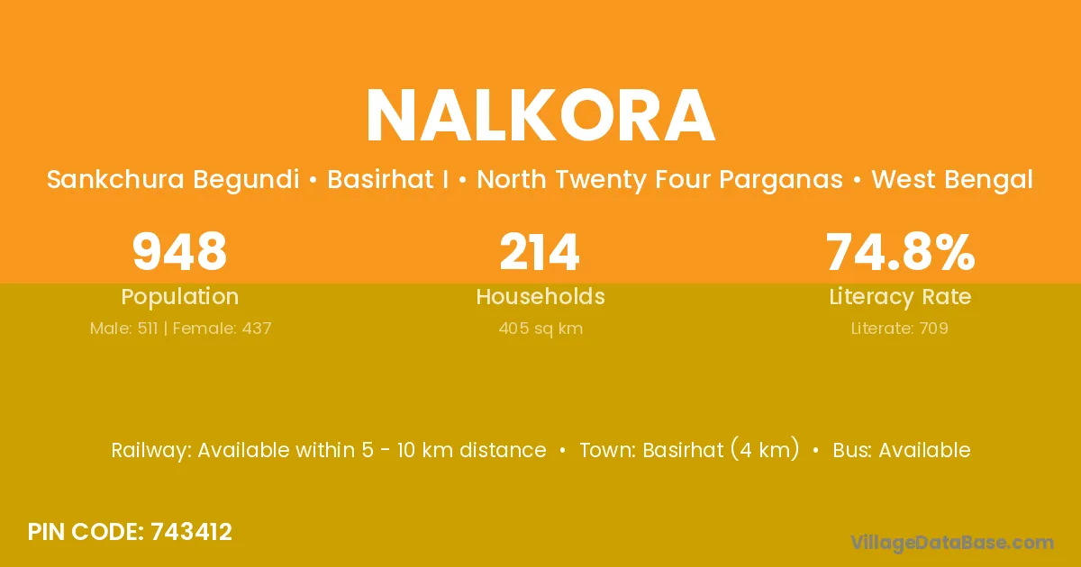 Basirhat (4 km) is the nearest town to Nalkora village for major economic activities and is located approximately 4 km away.