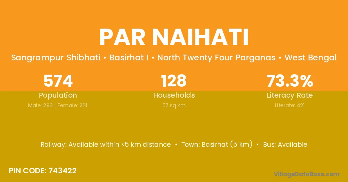 Par Naihati village has a total population of 574 people, of which 293 are males and 281 are females.