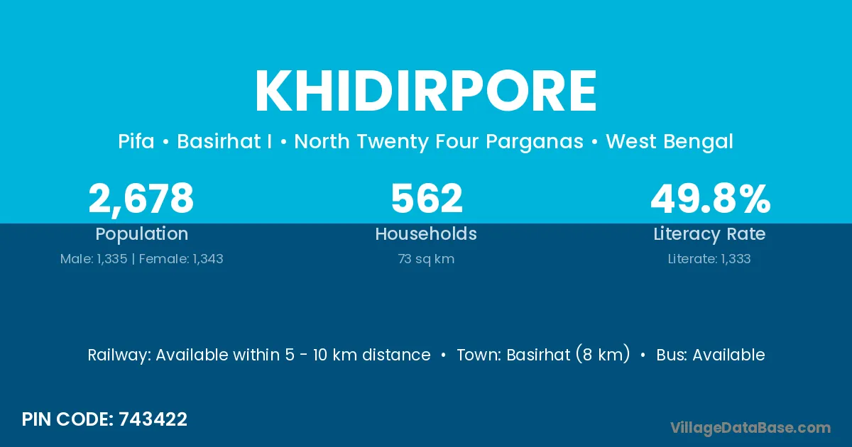 Basirhat (8 km) is the nearest town to Khidirpore village for major economic activities and is located approximately 8 km away.