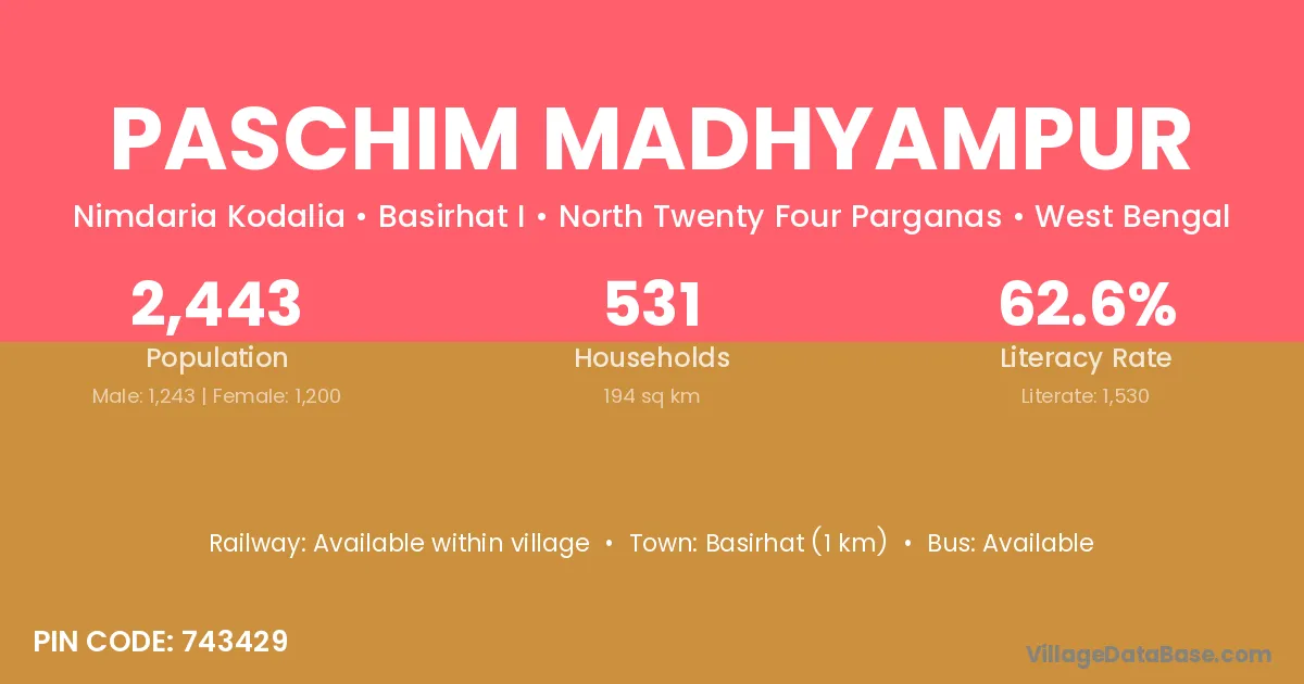 Basirhat (1 km) is the nearest town to Paschim Madhyampur village for major economic activities and is located approximately 1 km away.