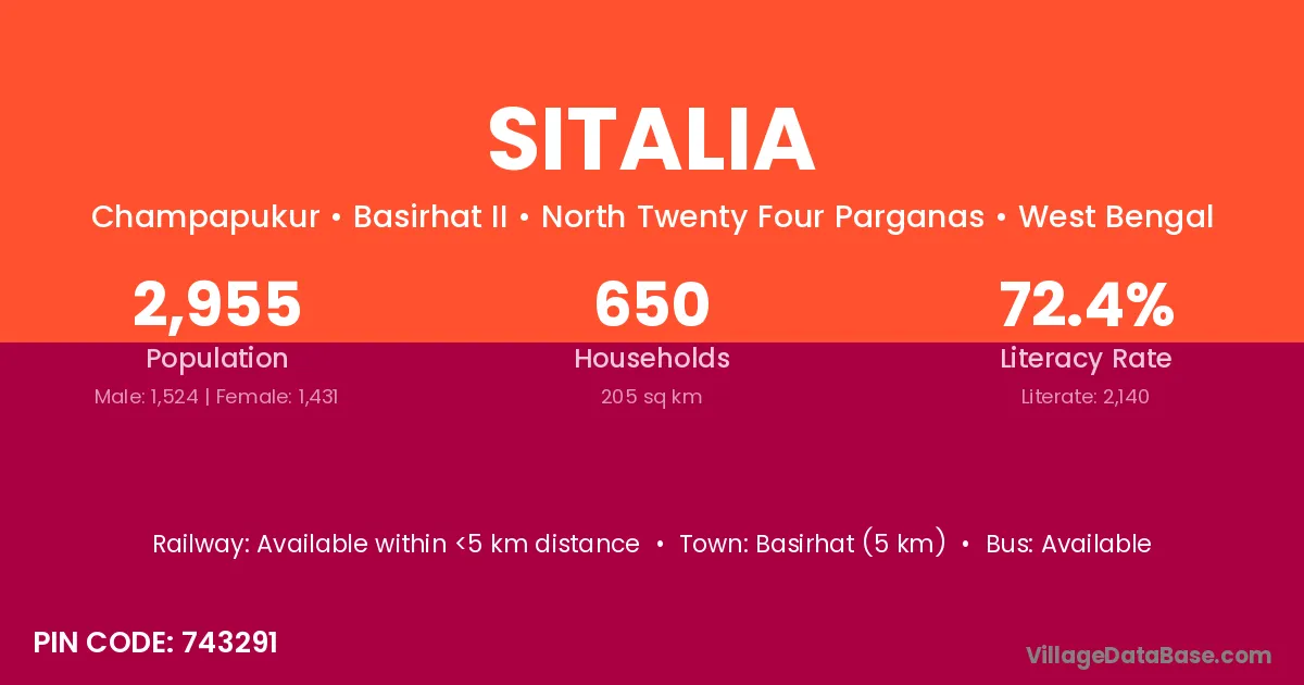 Basirhat (5 km) is the nearest town to Sitalia village for major economic activities and is located approximately 5 km away.