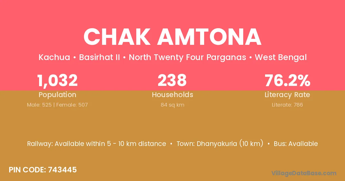 Dhanyakuria (10 km) is the nearest town to Chak Amtona village for major economic activities and is located approximately 10 km away.