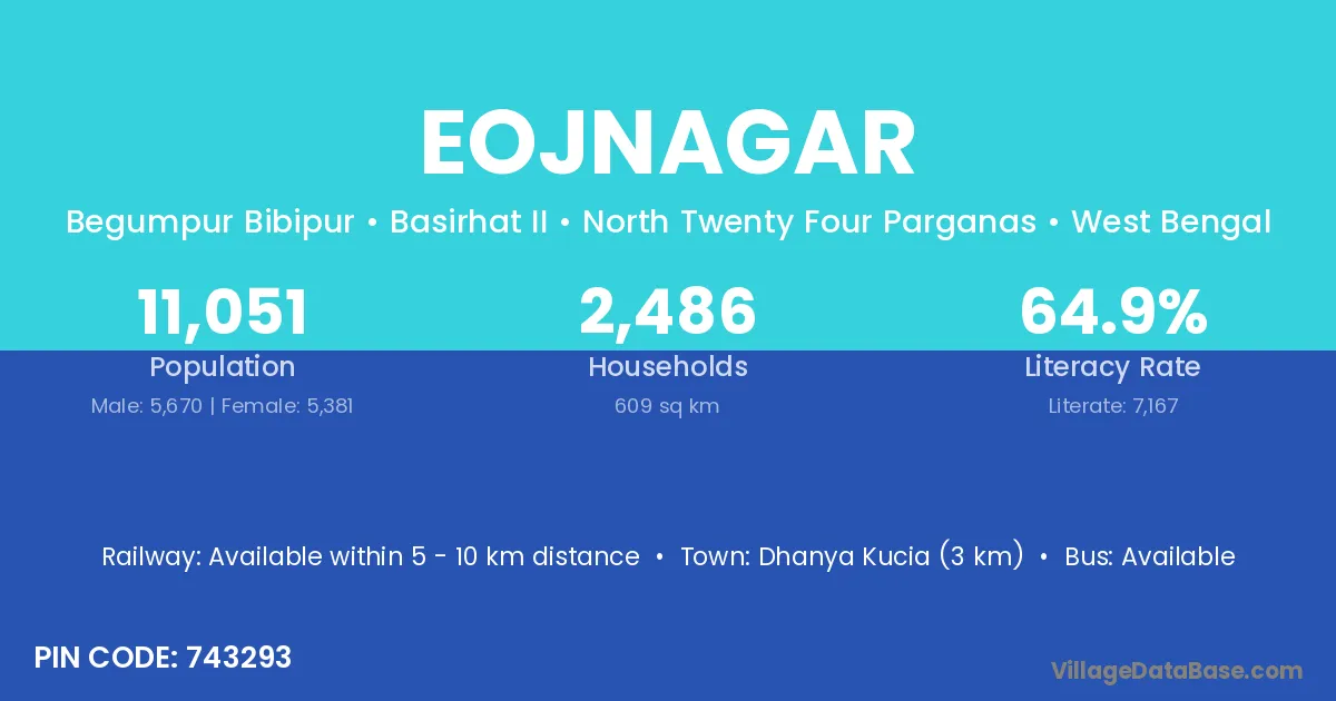 Eojnagar village has a total population of 11,051 people, of which 5,670 are males and 5,381 are females.
