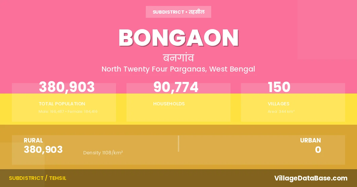 According to the 2011 census The total area of Bongaon Subdivision is 344 km², with a population of 380903 people. The population density is 1,108 inhabitants per square kilometre, and there are approximately 90774 houses in the sub district.