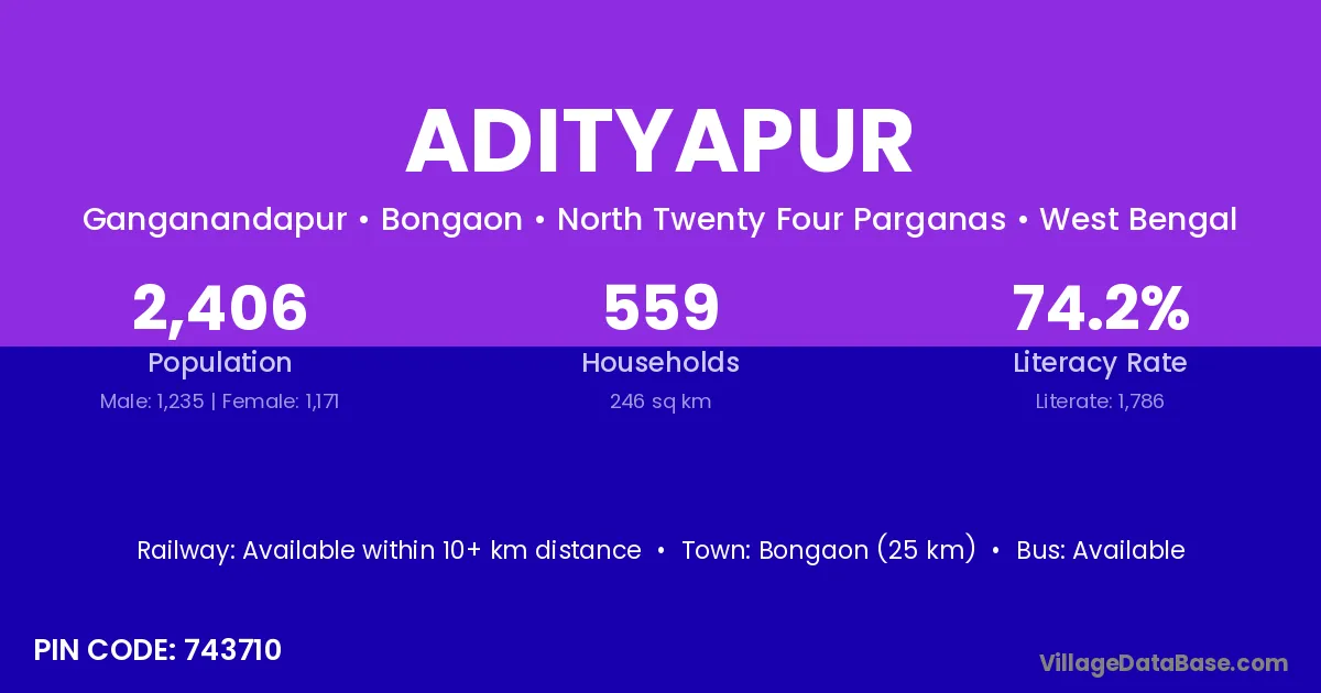 Bongaon (25 km) is the nearest town to Adityapur village for major economic activities and is located approximately 25 km away.