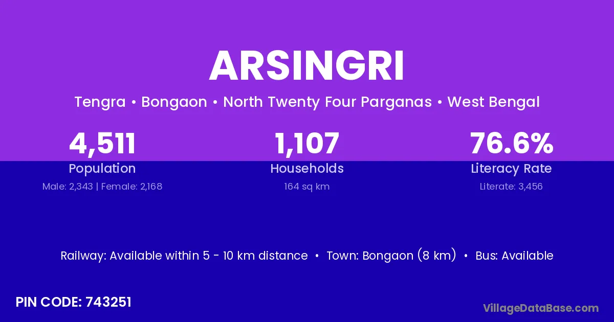 Bongaon (8 km) is the nearest town to Arsingri village for major economic activities and is located approximately 8 km away.