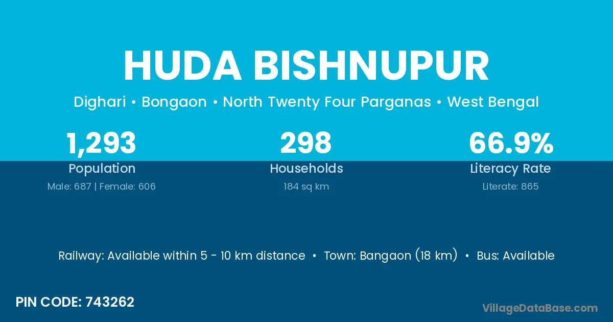 Bangaon (18 km) is the nearest town to Huda Bishnupur village for major economic activities and is located approximately 18 km away.