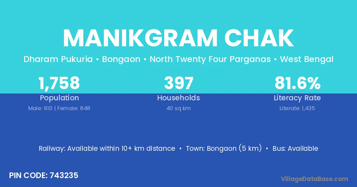 Bongaon (5 km) is the nearest town to Manikgram Chak village for major economic activities and is located approximately 5 km away.