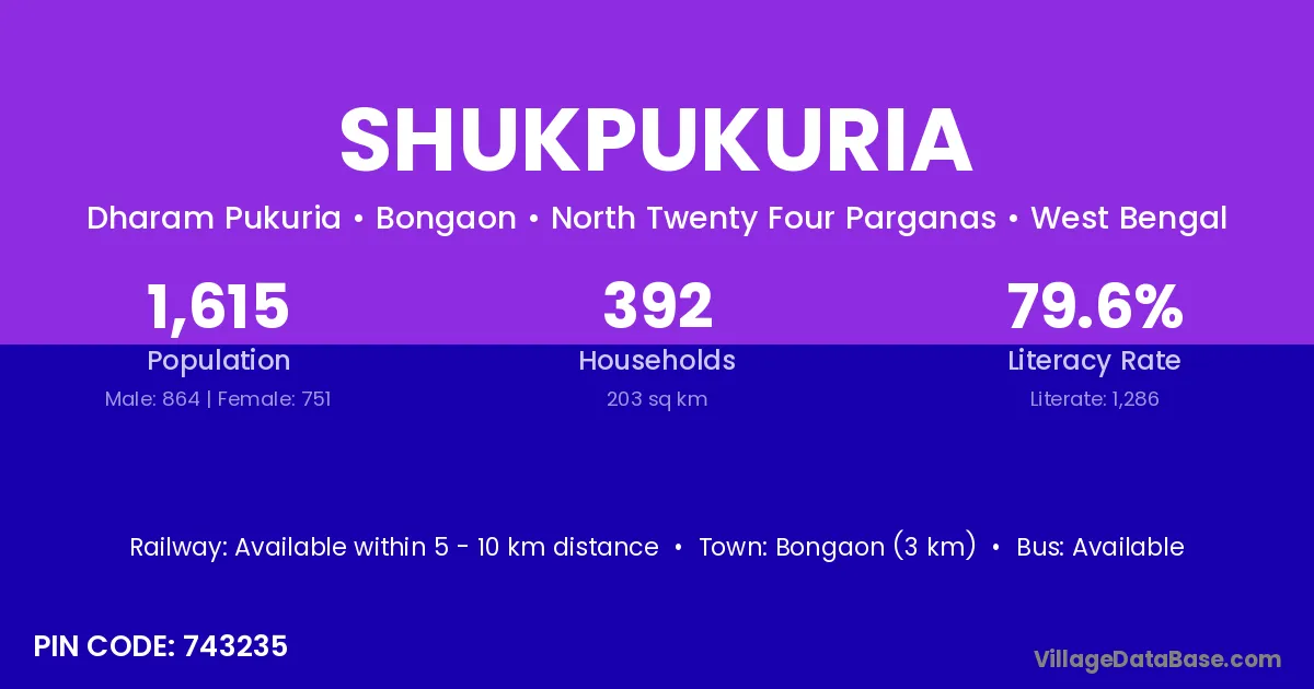 Bongaon (3 km) is the nearest town to Shukpukuria village for major economic activities and is located approximately 3 km away.