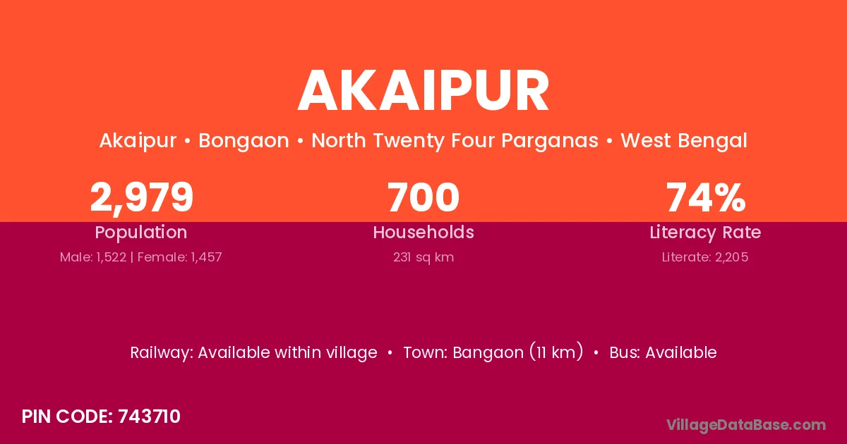 Bangaon (11 km) is the nearest town to Akaipur village for major economic activities and is located approximately 11 km away.