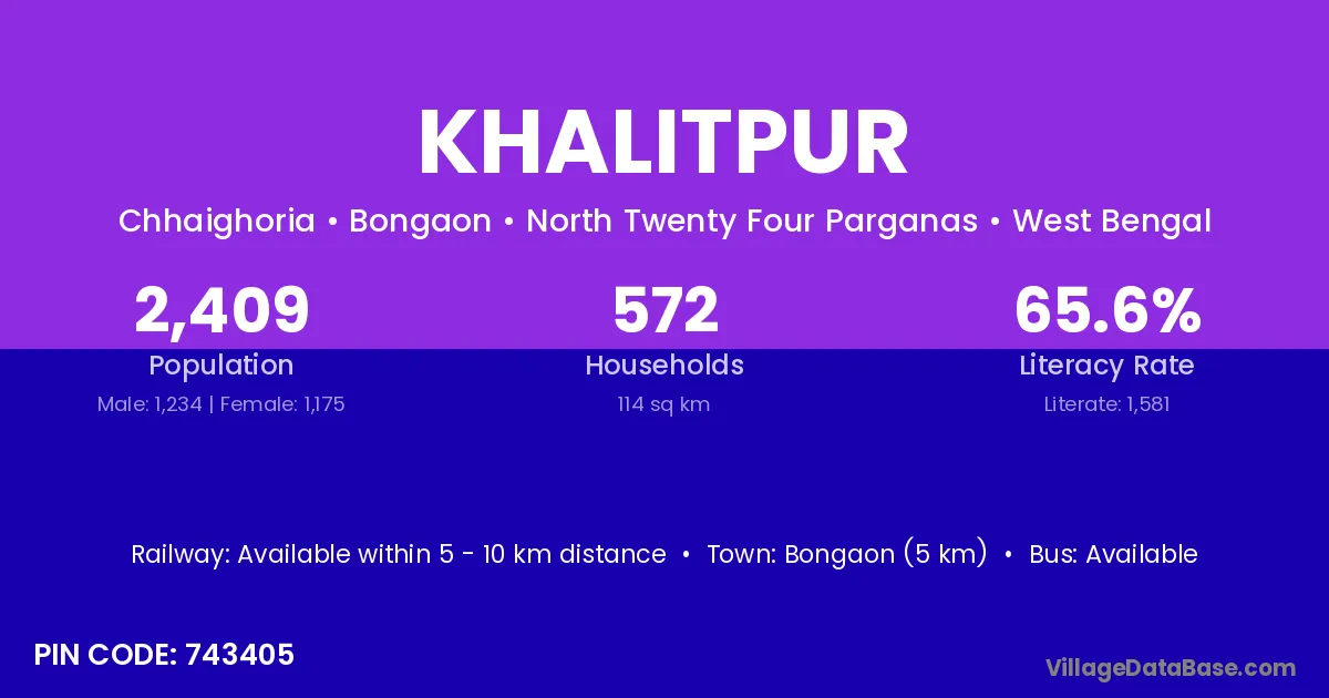 Bongaon (5 km) is the nearest town to Khalitpur village for major economic activities and is located approximately 5 km away.