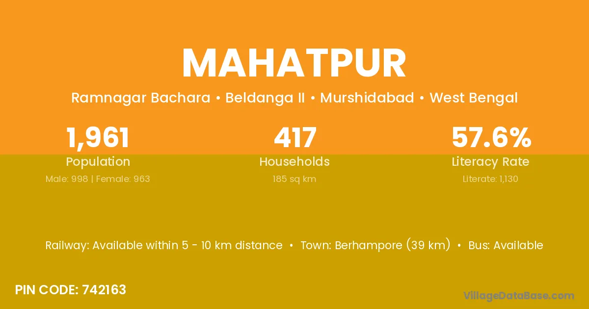 Bongaon (18 km) is the nearest town to Mahatpur village for major economic activities and is located approximately 18 km away.