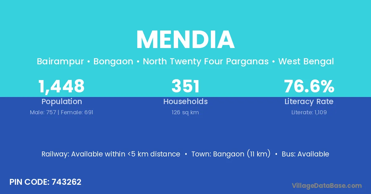 Mendia village is located in the Bongaon Subdivision of the North Twenty Four Parganas district in West Bengal.
