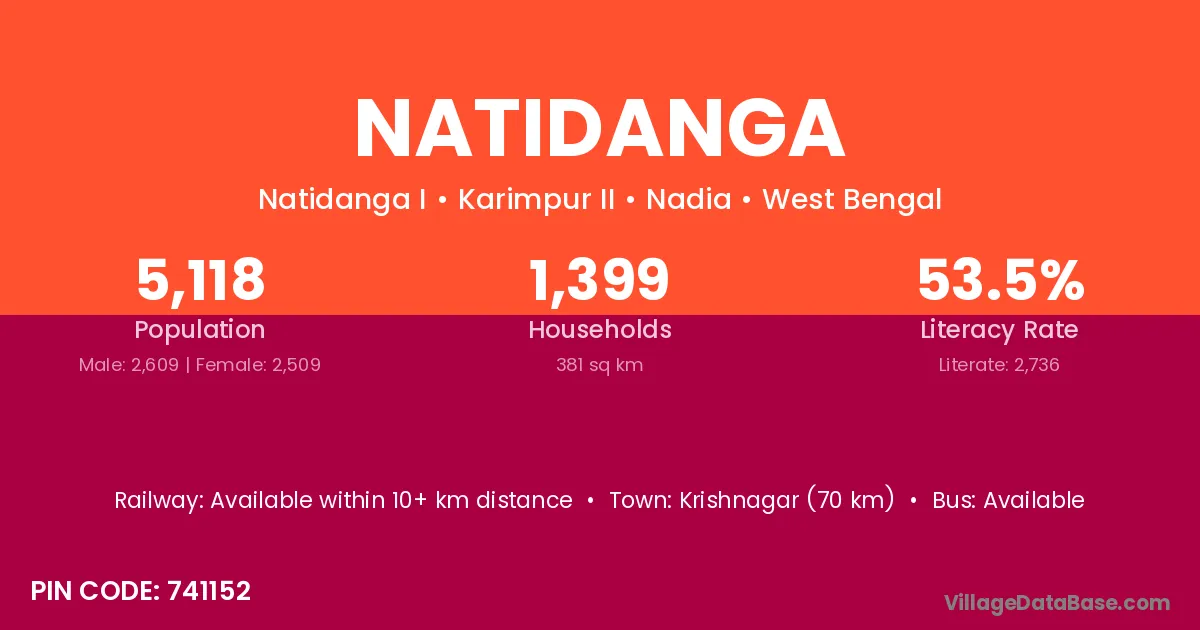 Gopalnagar (5 km) is the nearest town to Natidanga village for major economic activities and is located approximately 5 km away.