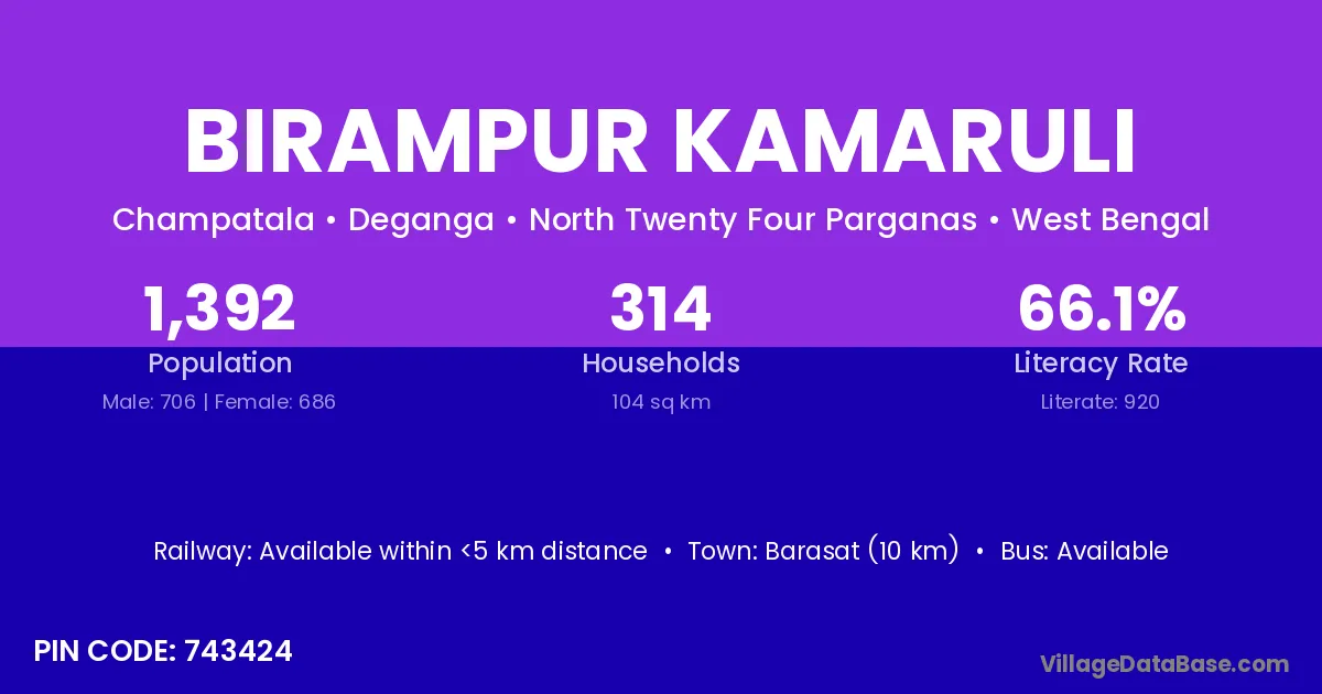 Barasat (10 km) is the nearest town to Birampur Kamaruli village for major economic activities and is located approximately 10 km away.