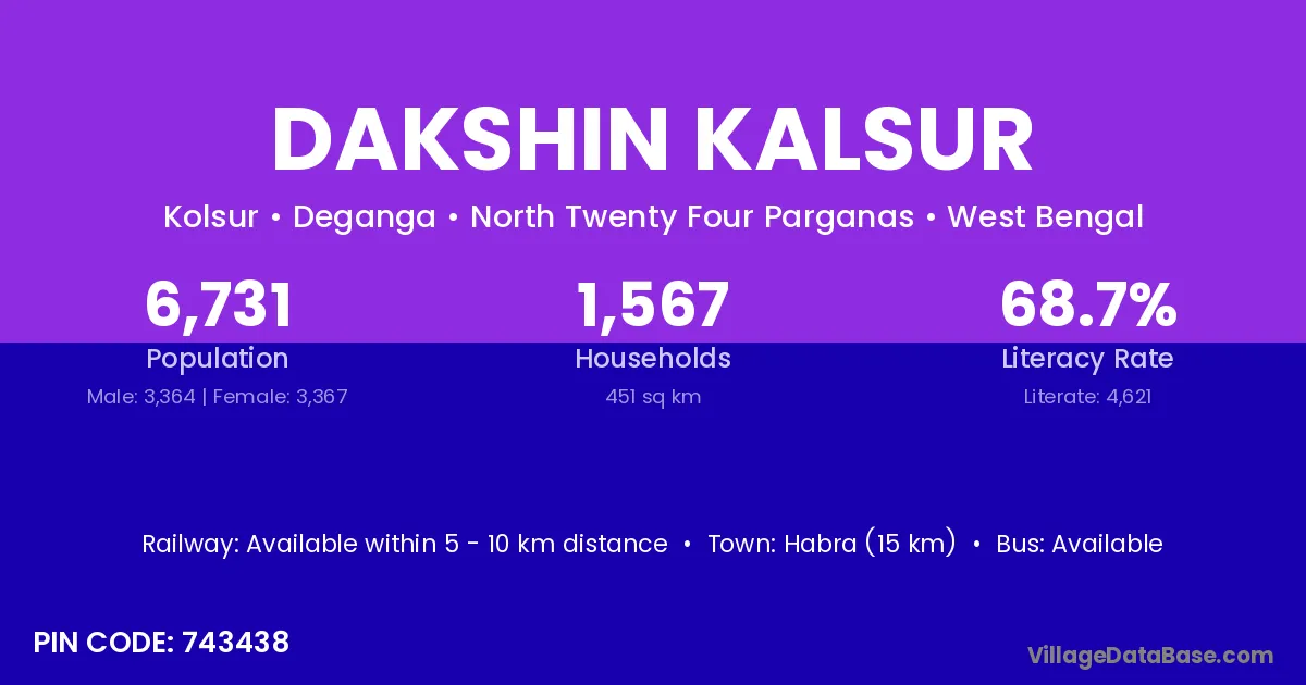 Habra (15 km) is the nearest town to Dakshin Kalsur village for major economic activities and is located approximately 15 km away.