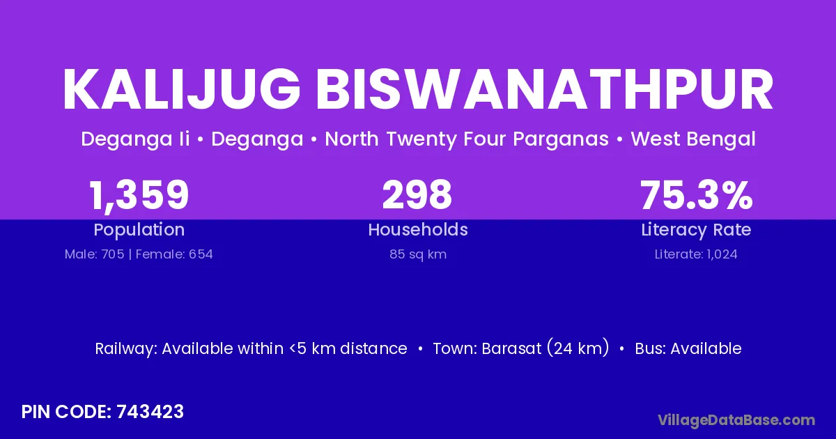Barasat (24 km) is the nearest town to Kalijug Biswanathpur village for major economic activities and is located approximately 24 km away.