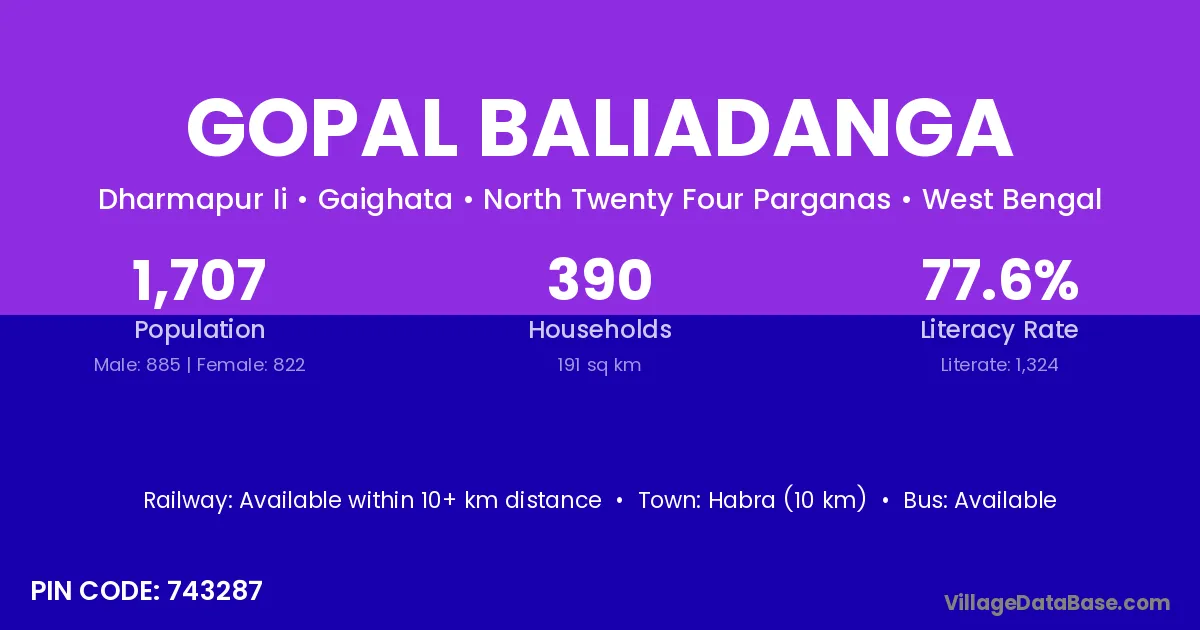 Habra (10 km) is the nearest town to Gopal Baliadanga village for major economic activities and is located approximately 10 km away.